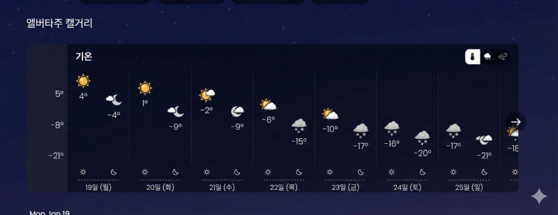 25일 (일): 눈 🌨 (최고 -17°C / 최저 -21°C)