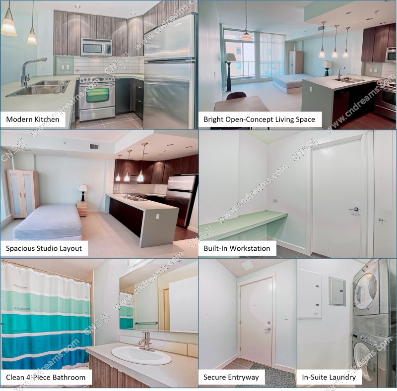 유닛은 오픈형 스튜디오 구조로 세련된 인테리어가 돋보이며, Dishwasher, 오븐/스토브, 전자레인지 후드, 냉장고, 세탁기·건조기, 욕조/샤워 시설, 창문 블라인드, 퀸 침대(여분 커버 포함), 옷장, 식탁과 의자, 협탁, 협탁 조명, 발코니 테이블과 의자, 접시·볼·샐러드 접시, 물컵, 포크, 스푼 등 생활에 필요한 모든 가구·가전·식기류가 완비된 완전 풀퍼니시드 유닛입니다. 짐만 들고 오시면 바로 입주 가능합니다!