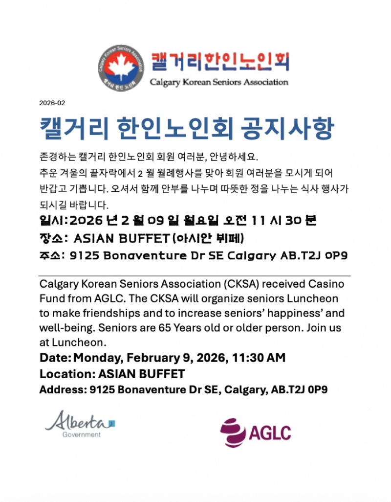 캘거리 노인회 행사 안내. 2월 9일(월)