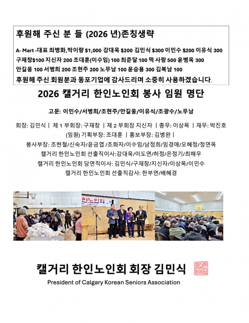 캘거리 노인회 신년 첫 모임 안내.. 1월 24일(토) 오전 11시
