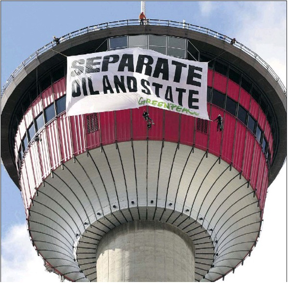 - 시위에 회원 8명 참여-지난 3일 환경보호단체인 그린피스 소속 회원 3명이 캘거리 타워에 오일샌드를 반대하는 현수막을 걸어 언론의 집중조명을 받았다. 캘거리 타워에 현수막을 설치하는데 총 8명의 그린피스 소속 회원이 참여했다. 캘거리 타워는 단순..